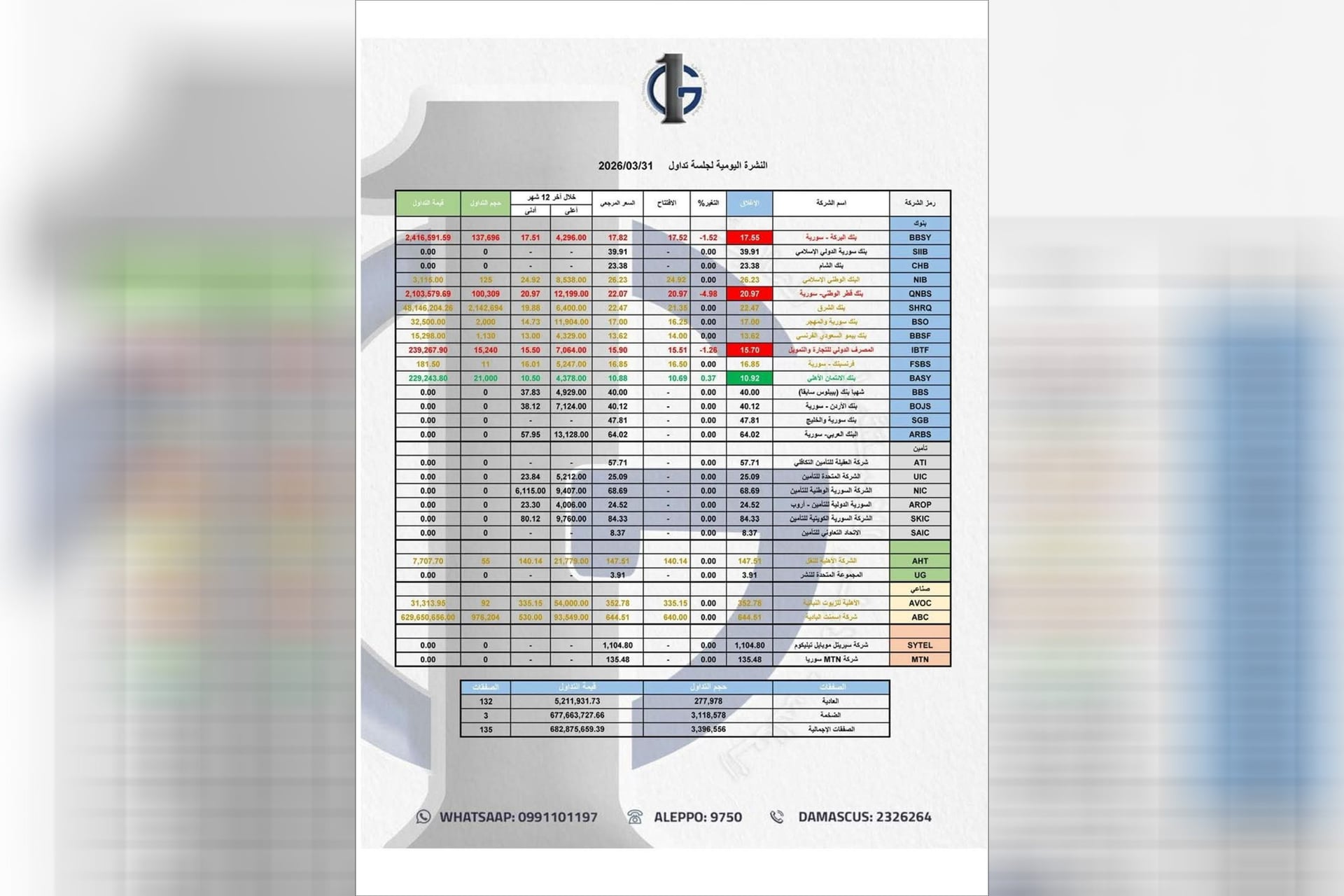 الجلسة شهدت كمان تنفيذ صفقة كبيرة بحجم 3,118,578 سهم، قيمتها تجاوزت الـ 677 مليون ليرة سورية جديدة. هالشي ساعد بشكل كبير برفع قيمة التداولات الكلية لليوم.