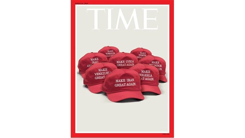 مجلة تايم نشرت غلاف جديد إلها، هالغلاف بيجي لينتقد السياسات العدوانية اللي عم يتبعها الرئيس الأمريكي دونالد ترامب. الغلاف بيظهر قبعة ترامب الحمرة اللي كتير معروفة، ومكتوب عليها أسماء تمن دول مختلفة. هي الدول هي: الصومال، العراق، فنزويلا، إيران، سوريا، اليمن، الإكوادور، ونيجيريا. هي الصورة على الغلاف بتلمّح لأوامر ترامب بشن هجمات أو أعمال عدوانية ضد هي البلدان من وقت ما رجع عالبيت الأبيض واستلم مهامو مرة تانية.