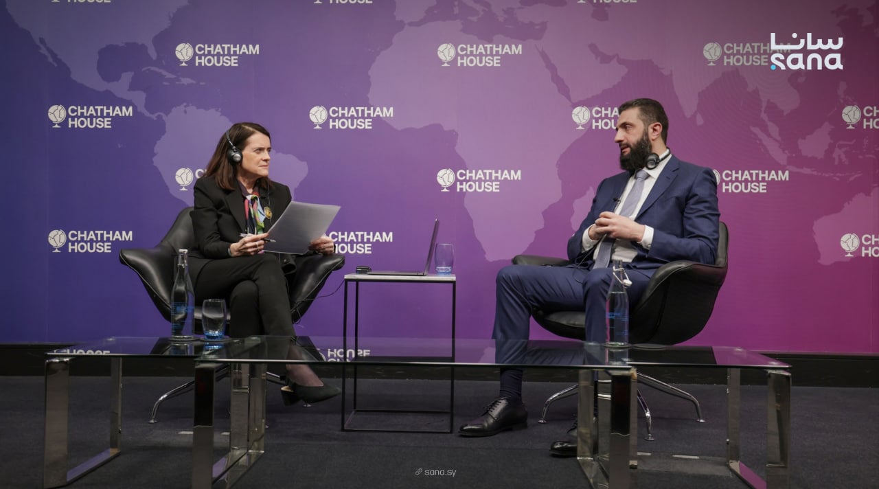 الرئيس أحمد الشرع حكى بـ تشاتام هاوس، المعهد الملكي للشؤون الدولية بلندن، عن رؤية سياسية شاملة لسوريا الجديدة. ركز خطابو على تحول استراتيجي باتجاه الحكم الديمقراطي، الحياد الإقليمي، وإنعاش الاقتصاد.
