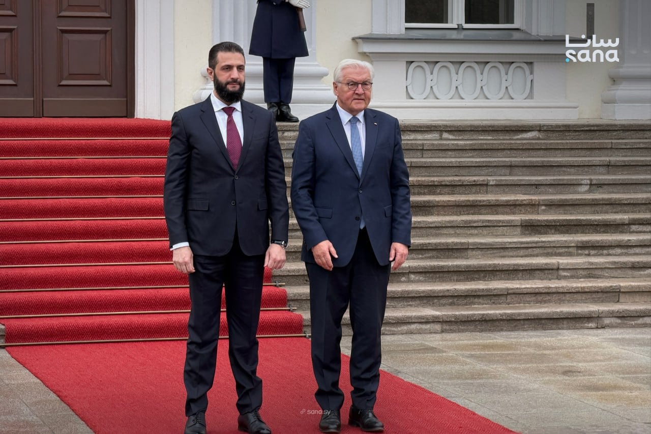 وصل الرئيس أحمد الشرع اليوم الإثنين لمدينة برلين الألمانية، وهي الزيارة الرسمية الأولى إلو لألمانيا. التقى الرئيس الشرع خلال زيارته بنظيره الألماني، الرئيس فرانك فالتر شتاينماير، وهاد اللقاء بيجي كجزء من جهود تعزيز العلاقات بين سوريا وألمانيا.
