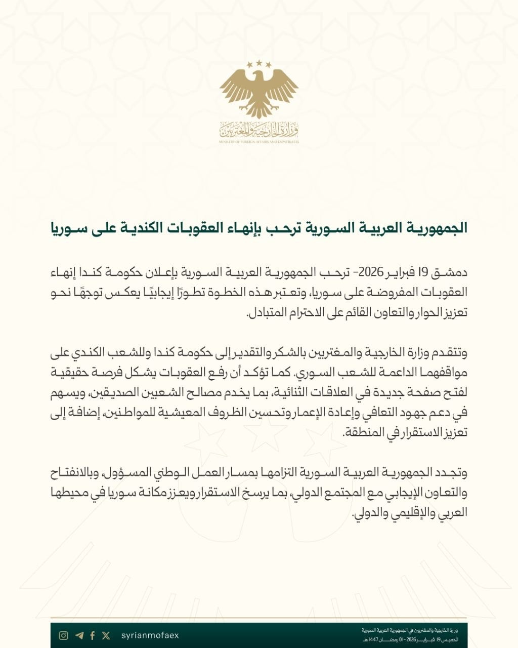 الوزارة صرّحت ببيان نزل على صفحاتها الرسمية يوم الخميس 19 شباط، وعبرت فيه عن شكرها وتقديرها للحكومة الكندية والشعب الكندي على وقفاتهم الداعمة للشعب السوري. وأكدت إنو رفع العقوبات فرصة حقيقية لنفتح صفحة جديدة بالعلاقات الثنائية، وهالشي بيخدم مصالح الشعبين الصديقين، وبيساهم بدعم جهود التعافي وإعادة الإعمار وتحسين ظروف معيشة المواطنين بسوريا، وكمان بيقوي الاستقرار بالمنطقة ككل.