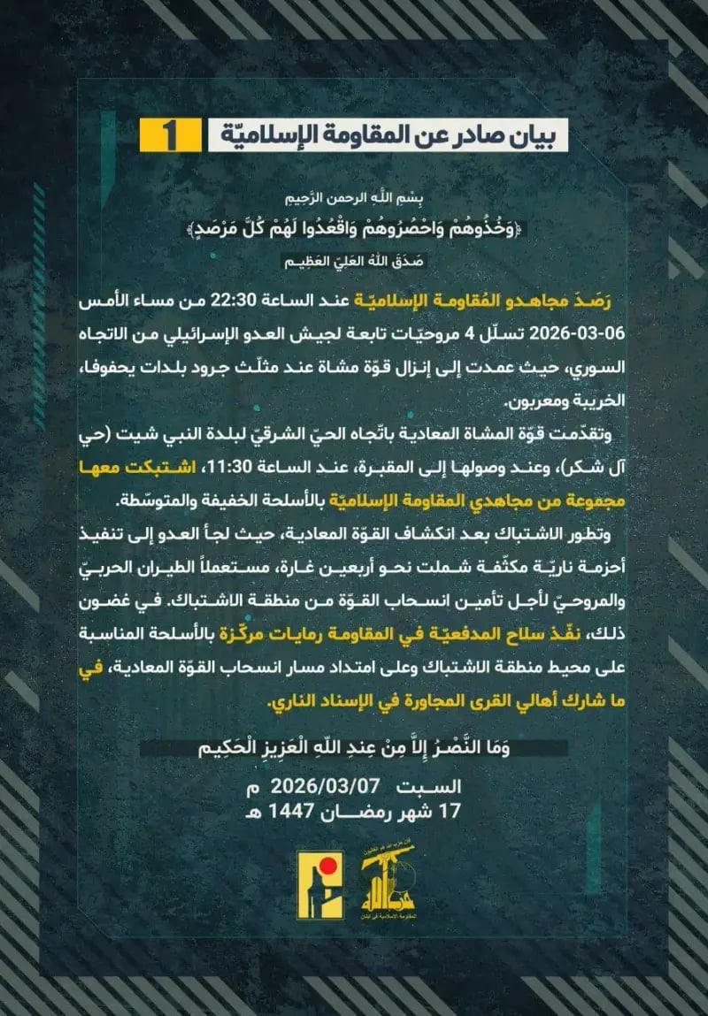 البيان اللي نشرو “حزب الله” وضح إنو عناصرو رصدوا الساعة 10:30 بالليل يوم الجمعة 6-3-2026 تسلل أربع مروحيات إسرائيلية من الجهة السورية، وهي المروحيات عملت عملية إنزال لقوة مشاة عند مثلث جرود بلدات يحفوفا والخريبة ومعربون.