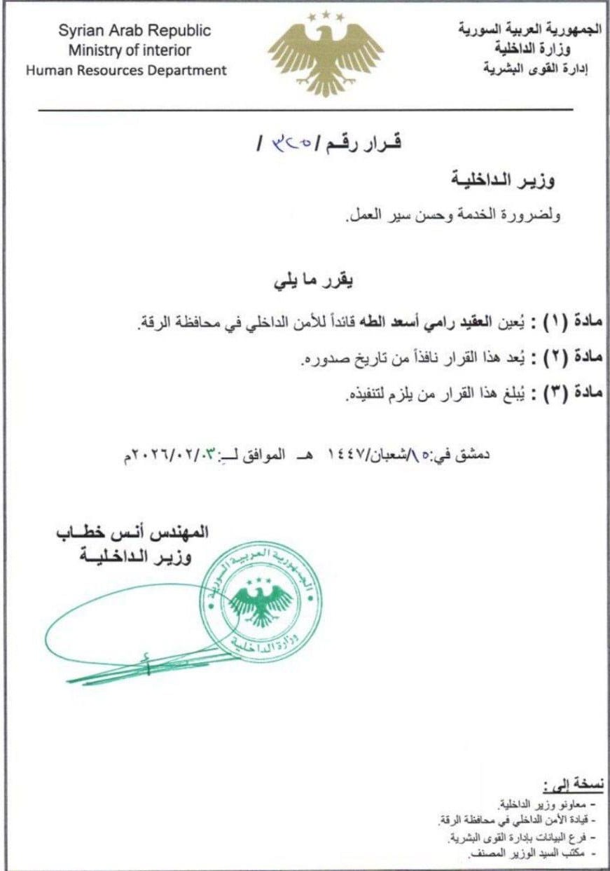 أصدر وزير الداخلية، أنس خطاب، قراراً إدارياً مهماً يوم التلاتاء اللي صادف 3 شباط، نص هالقرار على تعيين العقيد رامي أسعد الطه كقائد جديد للأمن الداخلي بمحافظة الرقة. هالتعيين بيجي ضمن سياق إعادة تنظيم الهياكل الأمنية بالمحافظة.
