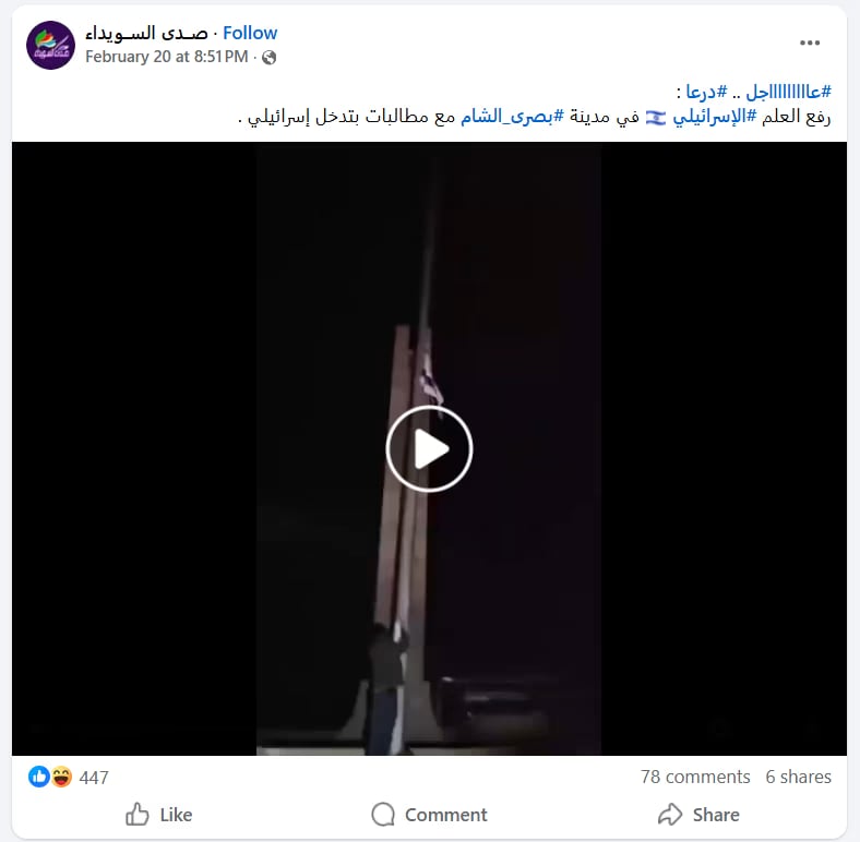 انتشر مقطع فيديو بشكل كبير على وسائل التواصل الاجتماعي، وعم يدعي ناشريه إنه بيورجي مشاهد حديثة لرفع العلم الإسرائيلي بمدينة بصرى الشام، اللي موجودة بريف درعا بجنوب سوريا. هالفيديو حصد عشرات الآلاف من المشاهدات والتفاعلات، خصوصاً إنه كان مرفق بوصف مضلل بيقول: “رفع العلم الإسرائيلي بمدينة بصرى الشام مع مطالبات بتدخل إسرائيلي”. هالنوع من المنشورات بيثير كتير بلبلة وقلق بين الناس، خصوصاً مع الوضع الحساس بالمنطقة.