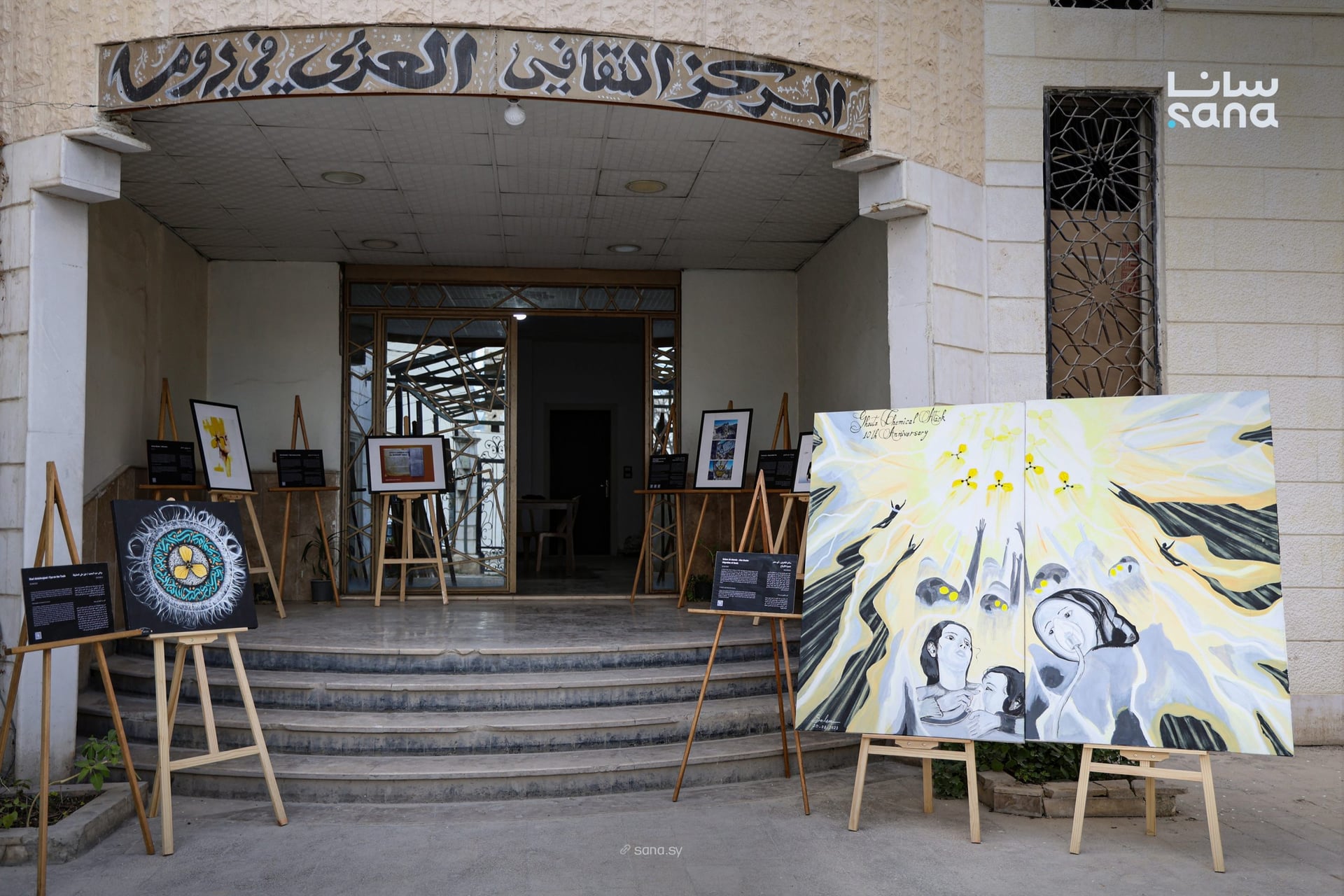 المعرض، ياللي استضافه المركز الثقافي بالمدينة، شهد مشاركة 11 فنان سوري. قدموا 12 عمل فني متنوع بين التصوير الضوئي واللوحات الزيتية والمجسمات المصنوعة من مخلفات الأسلحة. هالأعمال جسدت مشاهد الغرق والاختناق وآثار قصف النظام البائد الكيماوي، ياللي استهدف المدينة بسنتين 2013 و 2018. هالقصف خلى عشرات الناس تروح ضحية، أغلبهم نساء وأطفال، وآلاف تانيين انصابوا بأعراض اختناق وتسمم.