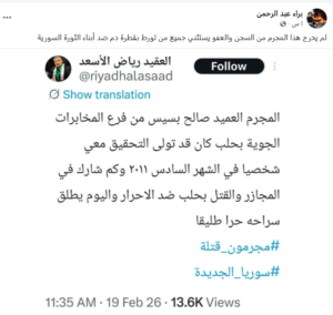 هالنفي من الوزارة إجا بعد ما العقيد رياض الأسعد، اللي انشق عن النظام البائد من بداية الثورة، نشر تغريدة على حسابو بمنصة “إكس”. قال فيها الأسعد إنو “المجرم العميد صالح بسيس من فرع المخابرات الجوية بحلب هو اللي تولى التحقيق معي شخصياً بشهر حزيران سنة 2011”.