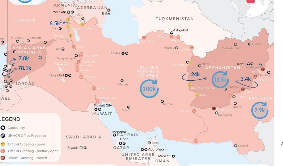 أما بإيران، فوصل عدد النازحين جوا البلد لـ 100 ألف نازح، وفي 6500 نازح إيراني قطعوا الحدود على تركيا. وسجلت المفوضية كمان رجوع 24 ألف نازح أفغاني كانوا عايشين بإيران على أفغانستان، وهاد الشي كان بسبب العدوان الأميركي الإسرائيلي.