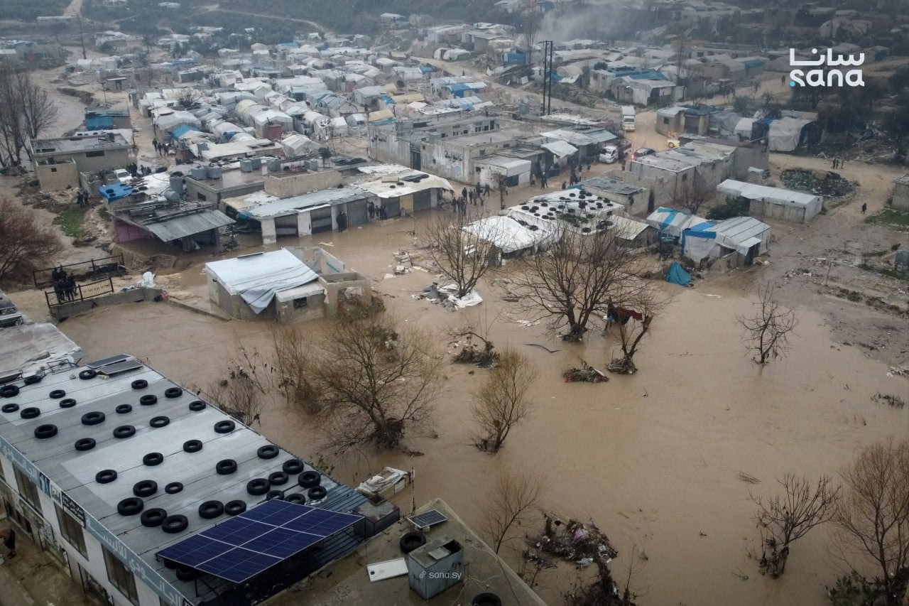 الفيضانات اللي صارت يوم السبت الماضي، بسبب الأمطار الغزيرة اللي نزلت على شمال وغرب سوريا، تسببت بسيول كبيرة جرفت وغمرت عدد من الخيم القريبة من مجاري المي الموسمية بمخيمات منطقة خربة الجوز غرب محافظة إدلب. وهالشي استدعى عمليات إجلاء سريعة للمتضررين، وفتح كذا مركز إيواء لاستقبالهم.