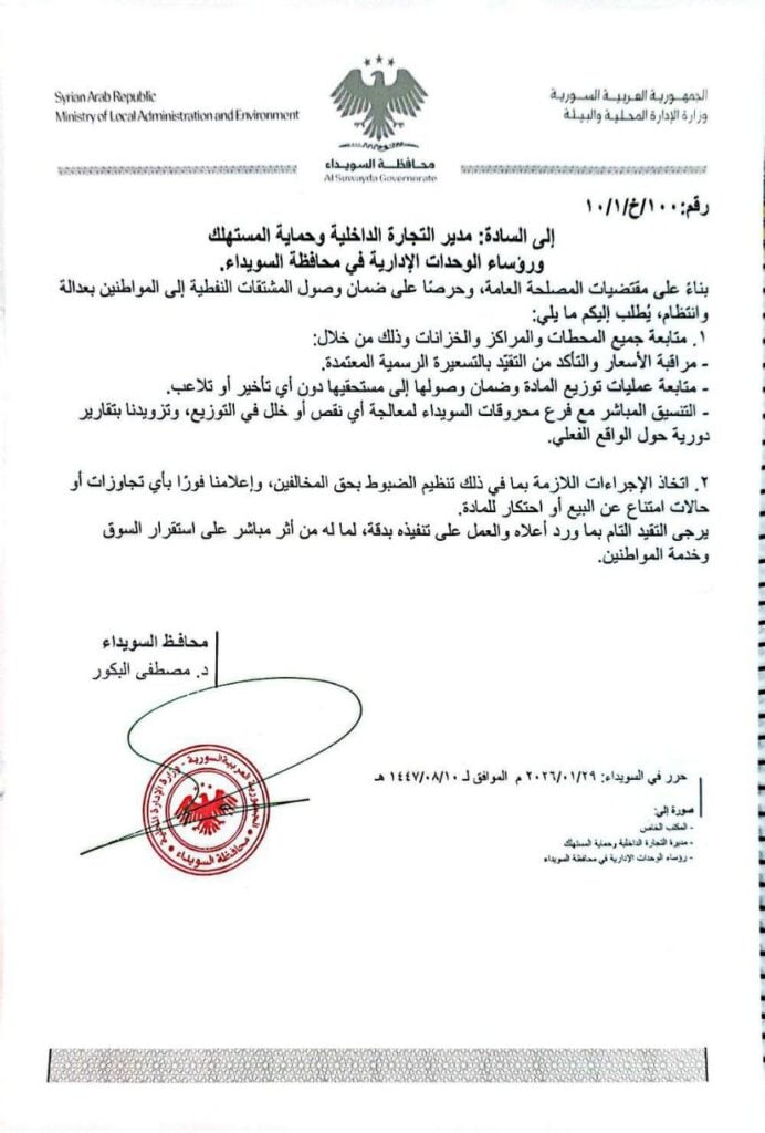 الرئيسية » محافظ السويداء يشدد الرقابة على الأسعار ومحطات الوقود