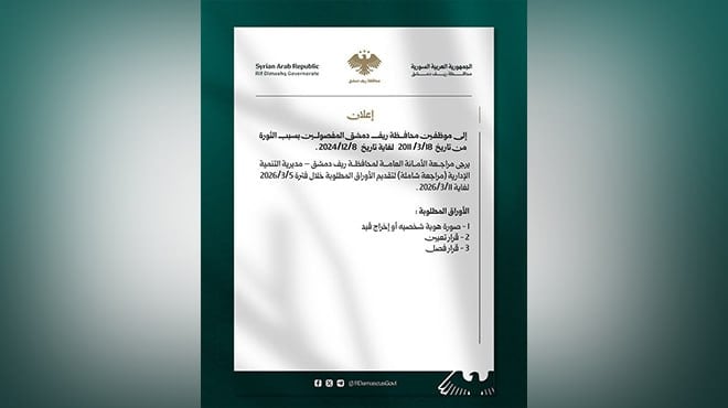 محافظة ريف دمشق دعت كل الموظفين اللي انفصلوا من وظايفهم بسبب مشاركتهم بالثورة، تحديداً بين تاريخ 18 آذار 2011 و8 كانون الأول 2024، إنو يقدموا أوراقهم ويخلصوا الإجراءات المطلوبة لحتى تتسوى أوضاعهم.