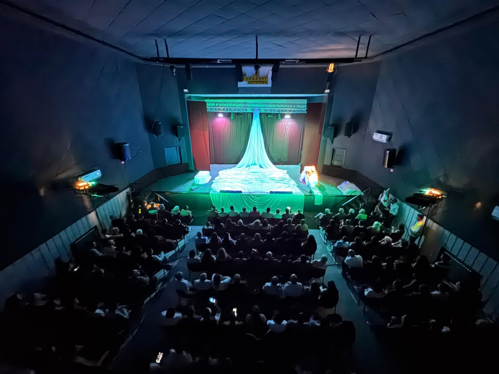 بهالمساحة البيضا اللي كأنها غيمة، قدر غزال يلعب بألوان كل مشهد، واستفاد من قصيدة “حفّار القبور” للشاعر العراقي بدر شاكر السياب. المخرج السوري حافظ على شعرية النص وعلى تشابكه مع الغيب والمجهول، وطرح أسئلة عن هالمفهومين بنفس الوقت. وين بيكون الإنسان قبل ما يولد، ووين بيروح بعد ما يتوفى؟ هالسؤالين بيرجعوا يسألونا عن مصير الإنسان بزمن المقابر الجماعية وتفكك هوياتنا الوطنية. هدول السؤالين هدفهم يخلوا الجمهور يفكر مع الممثلين طول عرض المسرحية اللي مدته 50 دقيقة. هالتفكير المشترك ما بعد عن البعد الدرامي للمسرحية، بالعكس، الصراع كان عالي ومرير بين القابلة والحانوتي. مرة عن مصير ولادهم اللي راحوا ضحية أمراض ما بيعرفوا شو سببها، ومرات بمحاولة يروضوا أحزانهم ويستحضروا نزول المطر على المقابر اللي حواليهم.