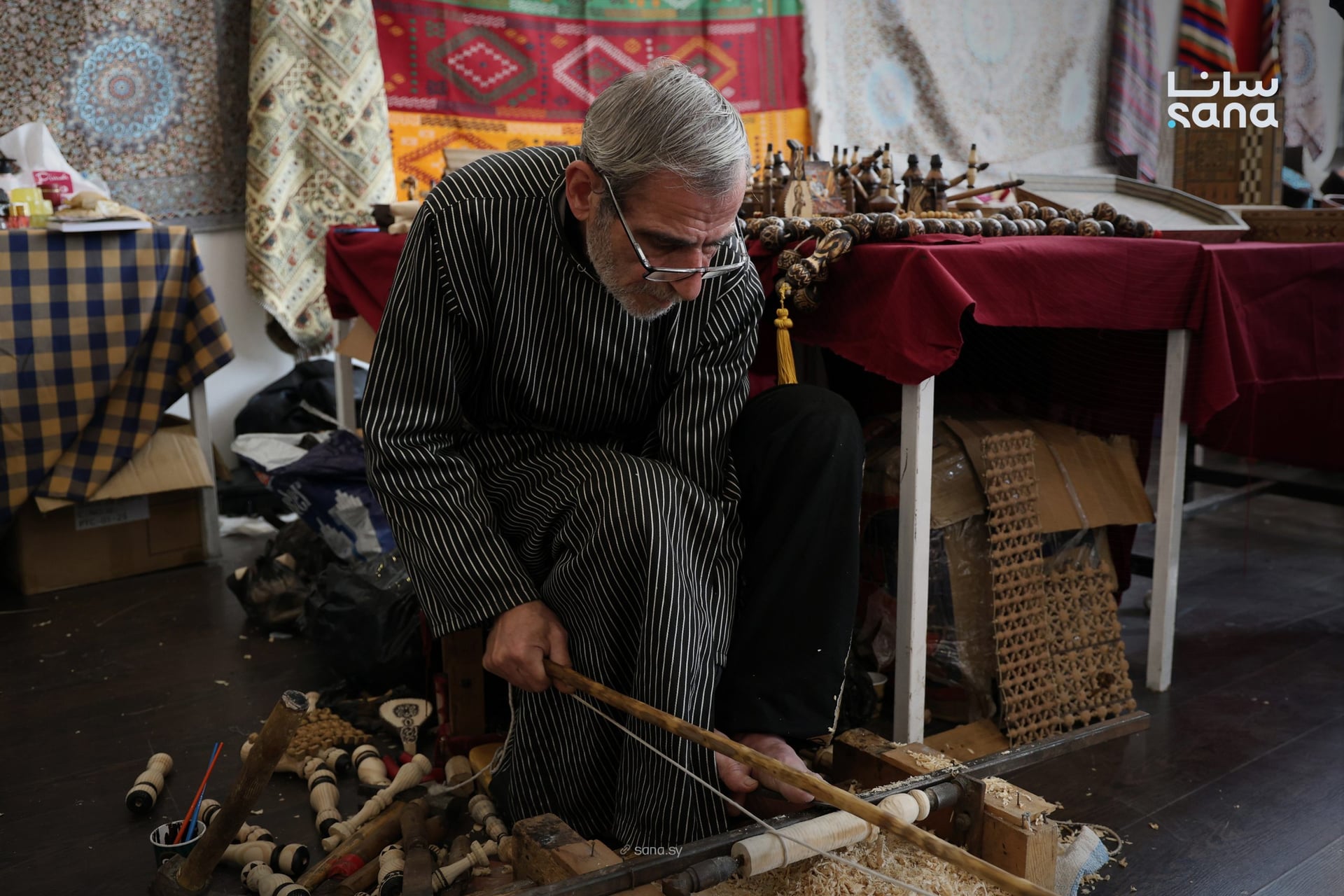 الحلاق عم يعرض مخرطة خشبية تراثية بتشتغل بالقوس والحبل، وهي آلة من زمن قبل الكهرباء. بتشتغل بتناغم دقيق بين الإيد والرجل والفكر، لتقدم لوحة حلوة كتير بتجمع بين المهارة والذوق الجمالي والذاكرة الدمشقية الأصيلة.